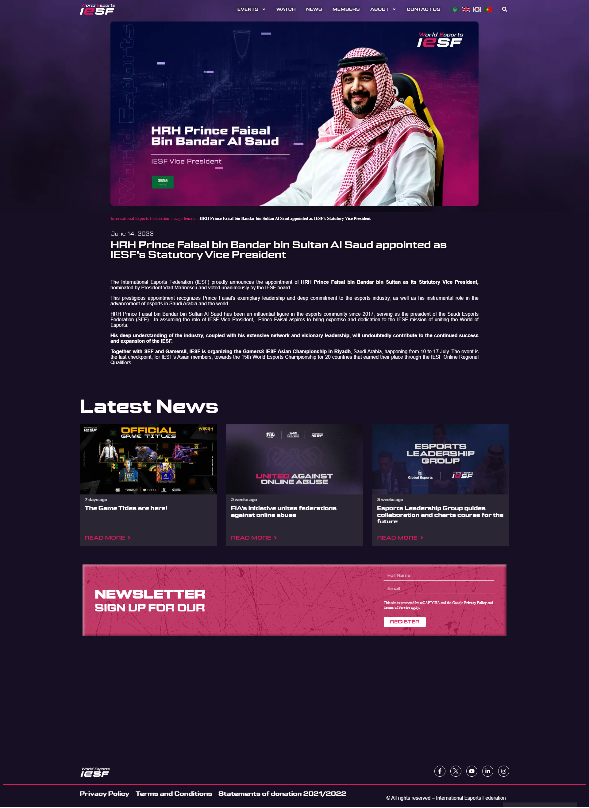 IESF appointed Saudi Arabian Prince Faisal bin Bandar bin Sultan as its President. Vlad Marinescu will step down down from his role. He stated "I am honored to have been trusted with this key position within the Federation and look forward to continuing the magnificent work that has been driven under Vlad’s remarkable leadership in recent years. Looking ahead, I am greatly enthused by the opportunities to elevate the world of sports to greater heights. With a strong emphasis on strategy, governance, and growth, the IESF will continue organizing exceptional tournaments and events, uniting the world’s elite esports athletes, and fostering an inclusive environment of fair competition to support the global esports community and drive our industry forward."